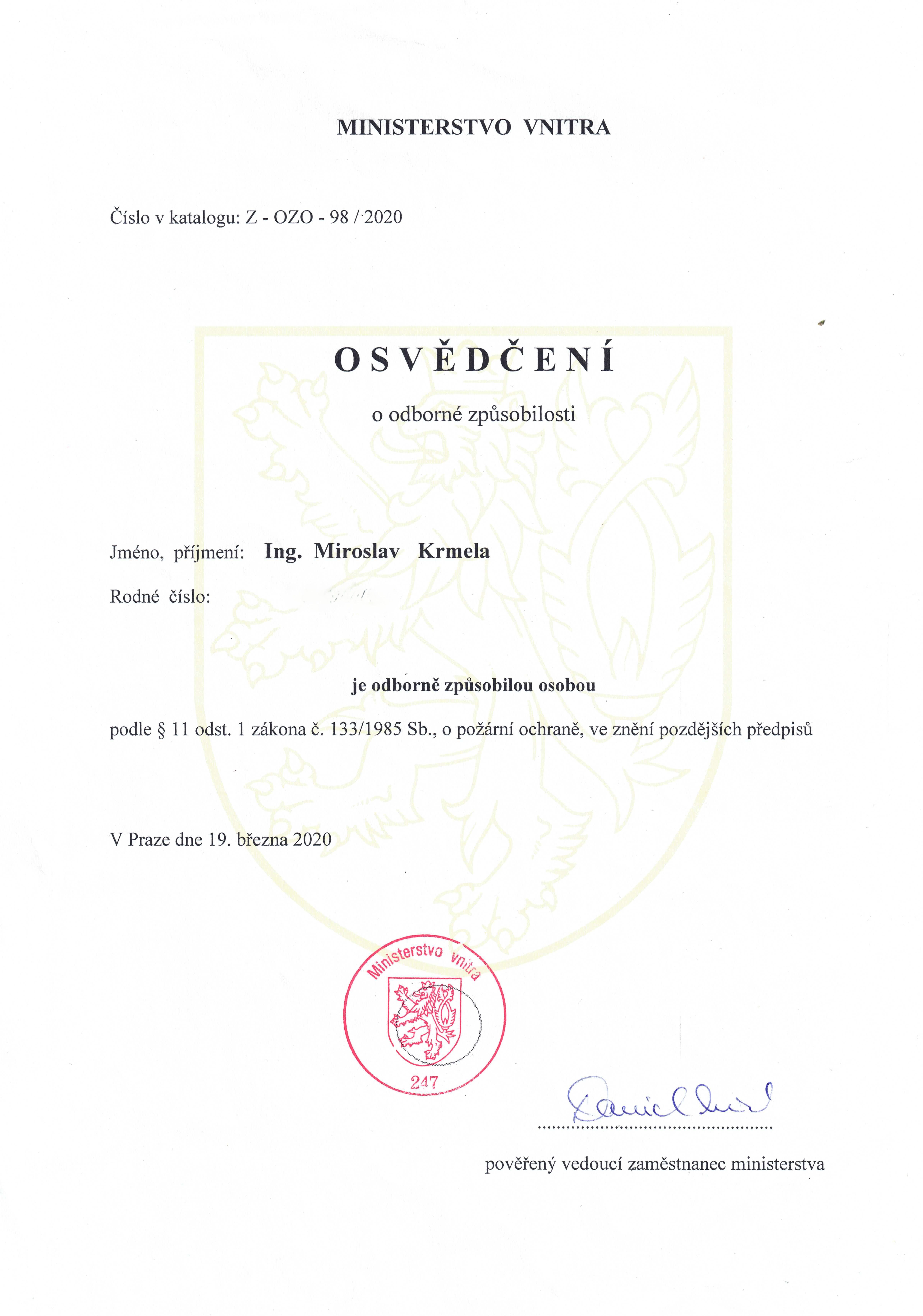 kat. č.: Z-OZO-98/2020 (osvědčení)
